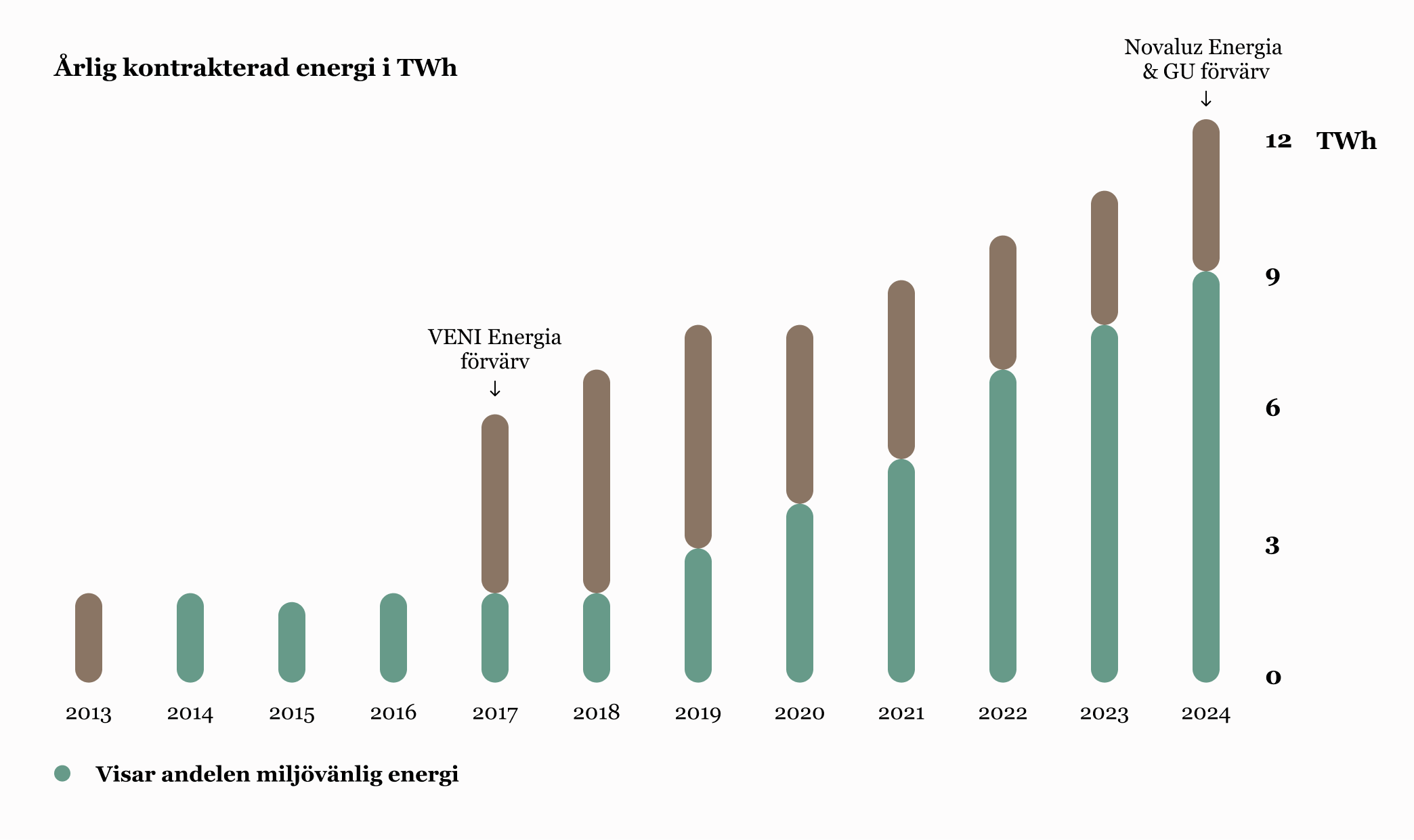 Under de senaste 10 åren har vi konverterat fler än 40 000 kunder från en energiförbrukning med höga utsläpp till låga utsläpp eller helt förnybar elektricitet. År 2024 levererade vi mer än 9 miljarder kWh dokumenterat fossilfri el till våra kunder. I Sverige och Norge har våra energikunder erhållit miljövänlig el sedan 2014.